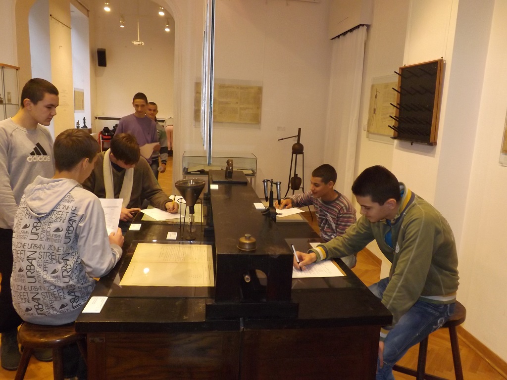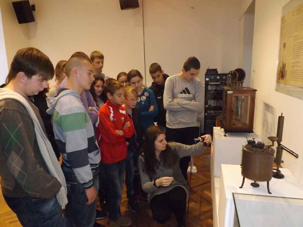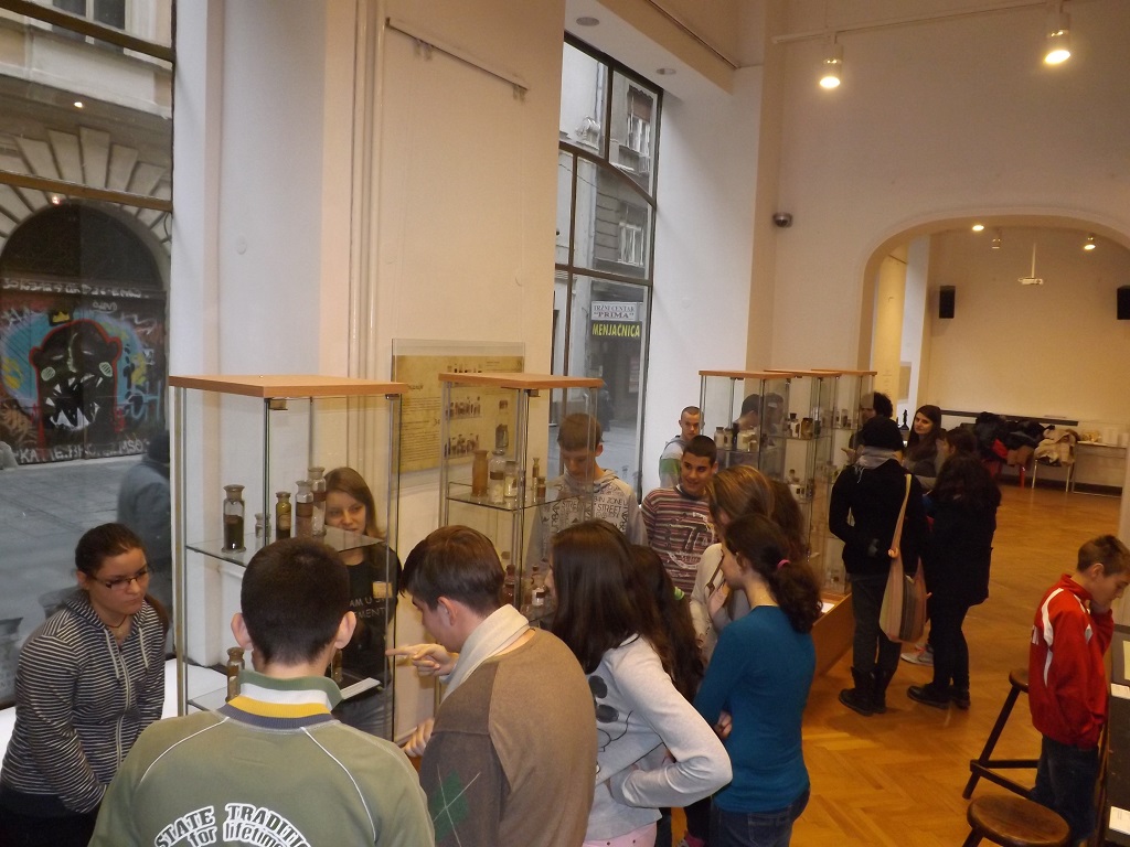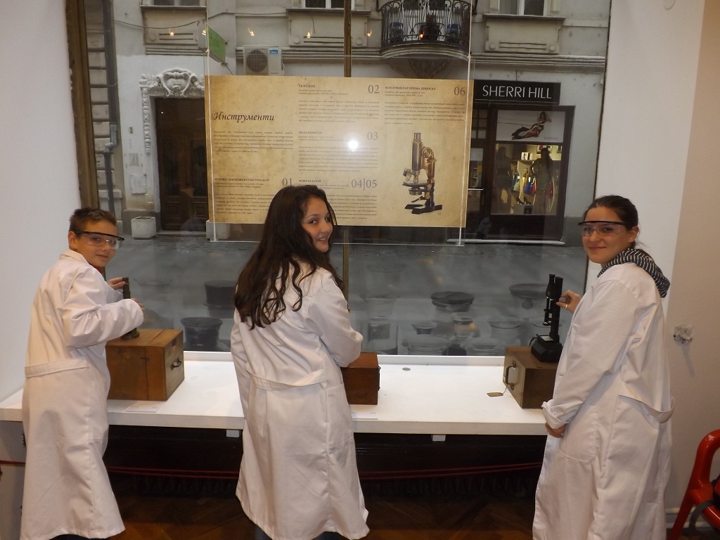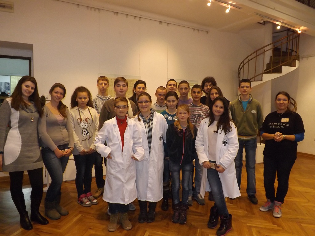 26.11.2013. године 15 ученика VII и VIII разреда су у пратњи наставнице хемије Милице Максимовић посетили изложбу Лабораторија великана – наслеђе српске хемије у Галерији Музеја науке и технике САНУ, Кнез Михаилова бр. 35. Изложбу су тумачити студенти Хемијског факултета у трајању од сат времена, а ученици су сазнали о почецима хемијске науке у Србији из угла оснивања прве хемијске лабораторије и како су радили и живели значајни српски хемичари тог доба. Изложено аутентично хемијско посуђе, прибор, супстанце и инструменти из друге половине 19. и са почетка 20. века су помогли ученицима у разумевању размишљања и рада хемичара тог времена. На крају тумачења ученици су попунили анкету и добили џепни периодни систем елемената на поклон.
