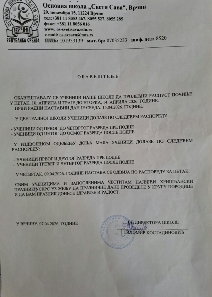 Вести Обавештење 8. април 2026. Post navigation Previous: Заједно у сусрет Васкрсу – радионица одељења 1/2Next: ИЗВЕШТАЈ О ОДРЖАНОЈ РАДИОНИЦИ у 4/3