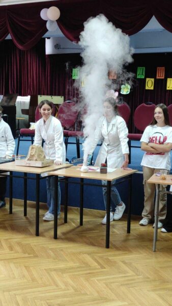 У уторак 11.10.2022. године са почетком у 9h нашу школу су посетили предшколци из вртића „Лане“ у пратњи својих васпитача. Овог пута смо за њих припремили нешто другачије, “Експерименталну представу” у жељи да се добро забаве и да школу доживе као изазовно место за учење кроз игру. Наставнице физике и хемије, Златана Ђорђевић и Милица Максимовић, заједно са својим тимовима који су чинили ученици шестог (Софија Бакаловић 6-2, Анушка Гајачки 6-2, Анастасија Радић 6-2, Анамарија Матејић 6-3 и Дуња Јанковић 6-3), седмог (Вук Брадарић 7-2) и осмог разреда(Јована Јерковић, Анастасија Пешић, Лука Тијанић 8-1) су се потрудили да повежу интересовања деце предшколског узраста са занимљивим експериментима. Тако да су деце кроз причу, машту и ефекте огледа путовали са Духом из Аладинове чаробне лампе до вулкана у Европи, слона у Африци коме су прали зубе и црне мамбе која се камуфлира на дрвећу. Помоћу ватре убацивали су кувано јаје у флашу, уживали у плесу пинг понг лоптица, одвајали шпенадле од пиринча помоћу магнета.