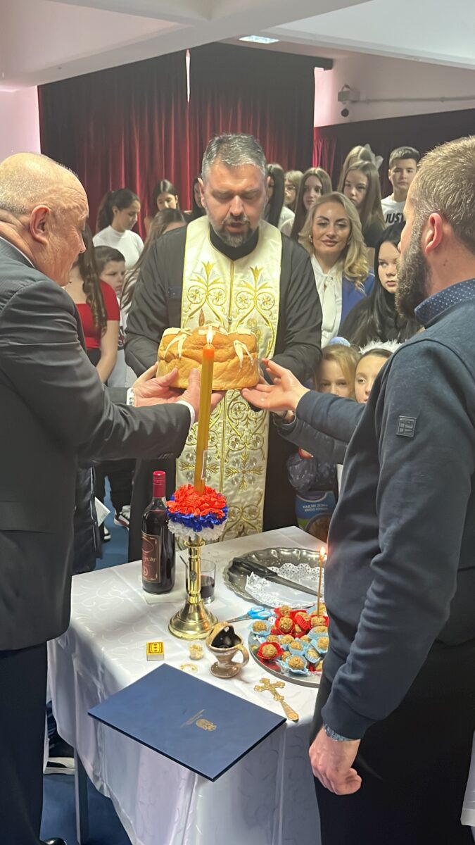 Након доделе награда приступили смо резању славског колача уз благослов и молитву оца Димитрија, старешине Храма Светих апостола Петра и Павла у Врчину. Резању славског колача приступили су директор школе Добрица Синђелић, ученици и наставници наше школе као и чланови Ученичког парламента са вероучитељем Предрагом Младеновићем и наставником географије Нинославом Михајловићем.