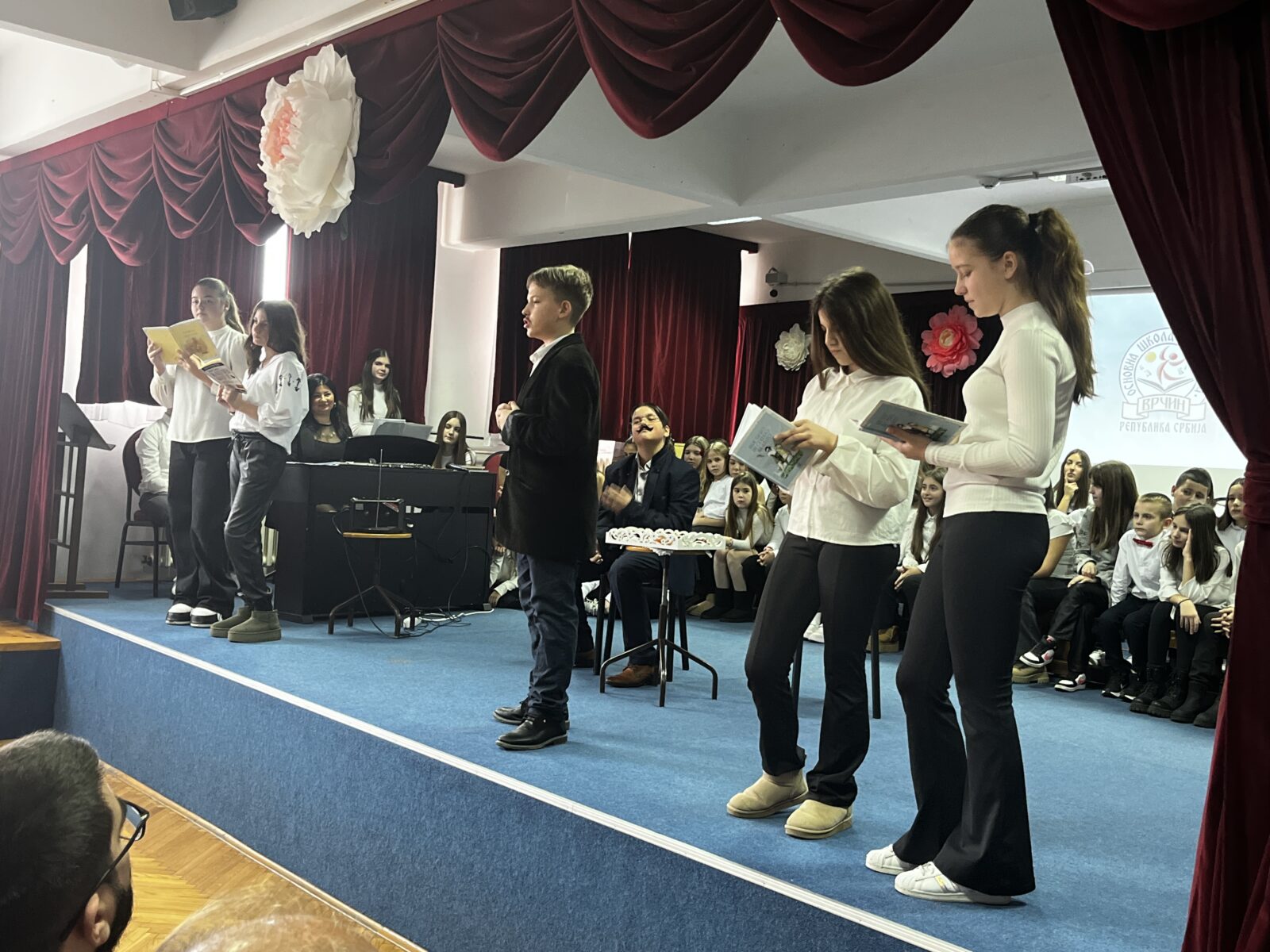 Као што је већ речено, програм смо започели филмом о школи који је настао захваљујући искреном залагању директора наше школе Добрице Синђелића, родитеља ученика наше школе Горана Димића и наставнице српског језика Слађане Вагић која је све организовала, помно испратила и реализовала. Наставница српског језика Слађана Вагић је и руководилац драмско – рецитаторске секције чији чланови су наступили на данашњој прослави у сарадњи са вероучитељем Предрагом Младеновићем.